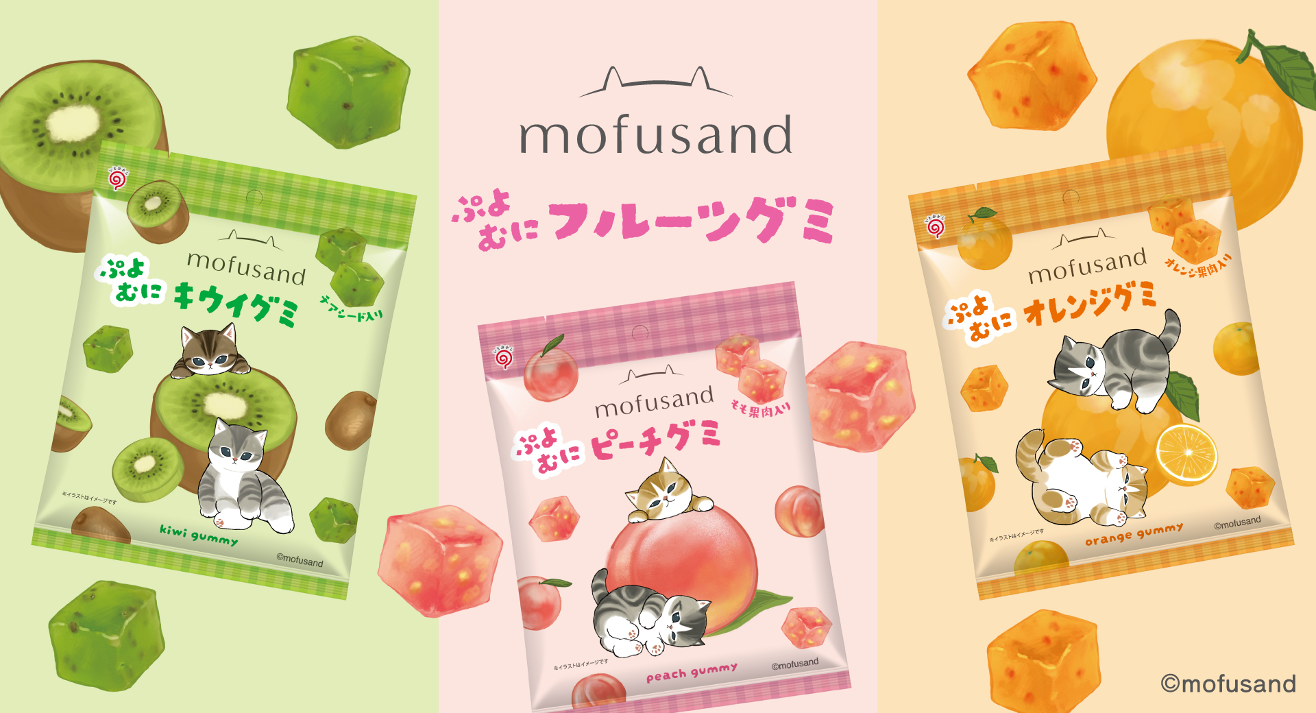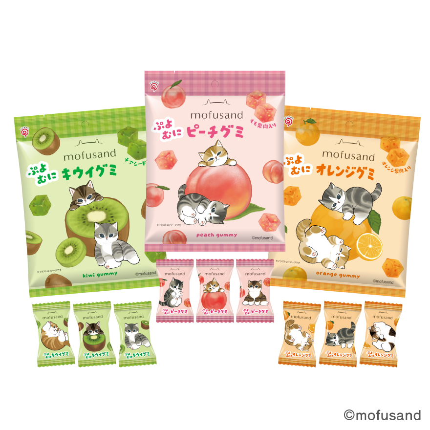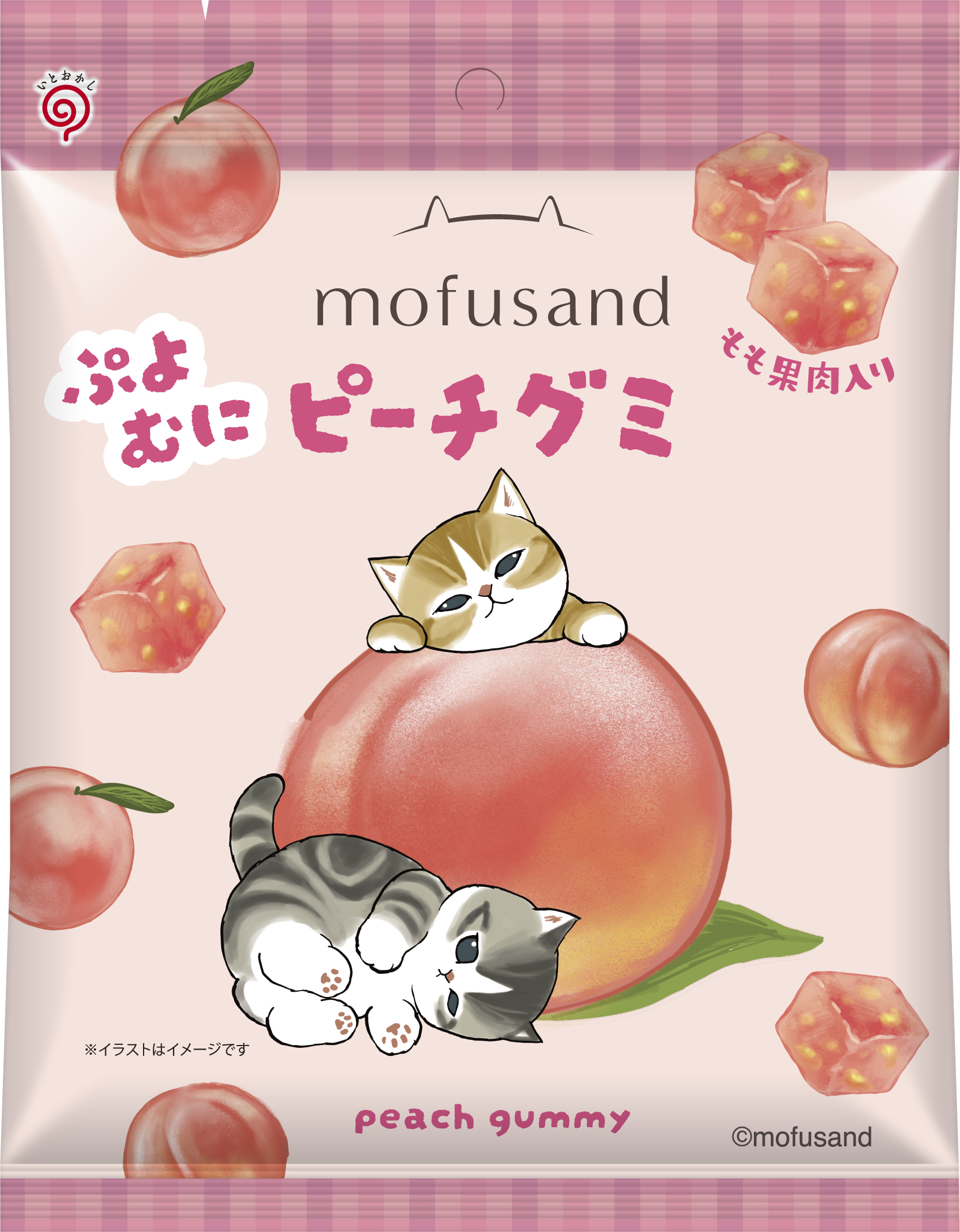 もふもふでキュートで、ちょっとシュールな「mofusand」のにゃんこたちのぷよっ、むにっ、としたピーチ果肉入りピーチ風味グミ。