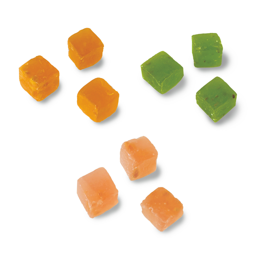 フルーツの味わいとぷよむに食感がクセになるオレンジ・キウイ・ピーチの3種類の果肉入り。※キウイは果実をイメージしたチアシード入りです。