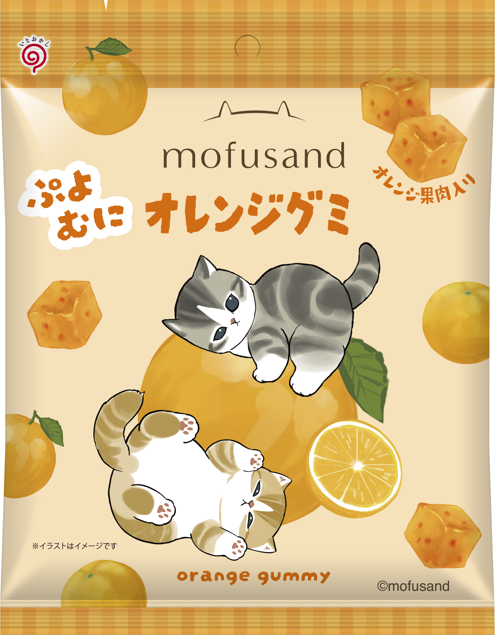 もふもふでキュートで、ちょっとシュールな「mofusand」のにゃんこたちのぷよっ、むにっ、としたオレンジ果肉入りオレンジ風味グミ。