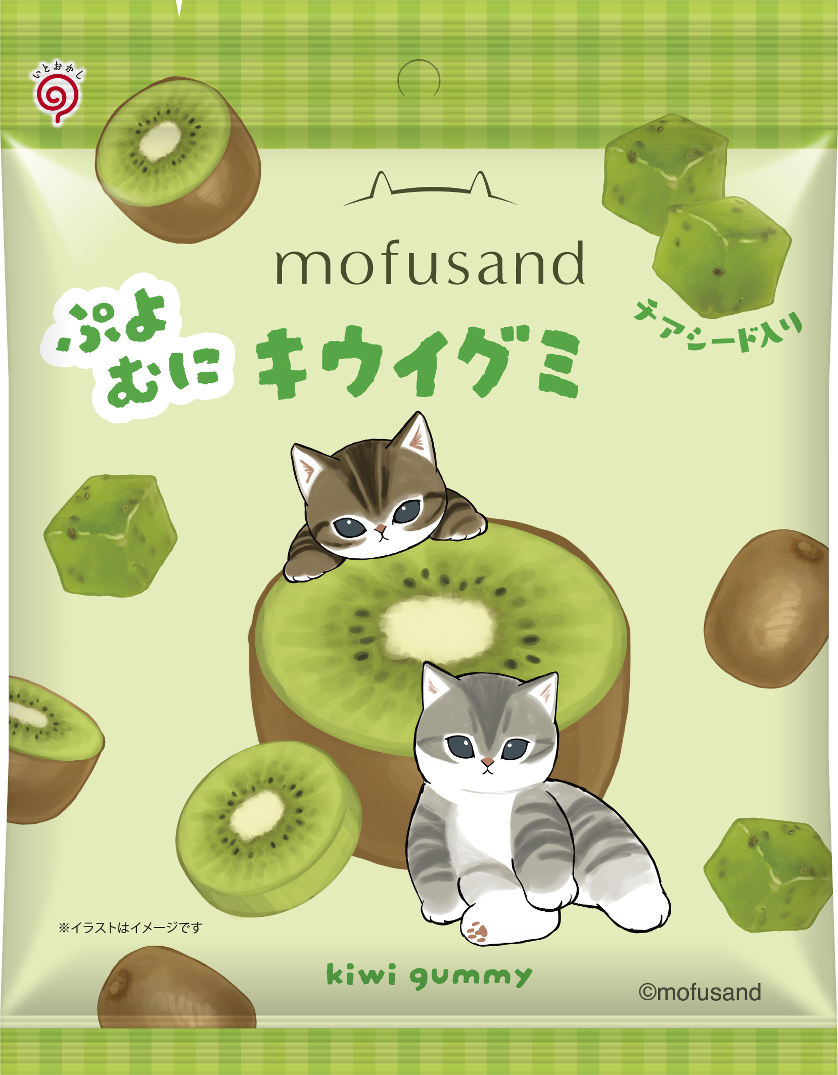 もふもふでキュートで、ちょっとシュールな「mofusand」のにゃんこたちのぷよっ、むにっ、としたチアシード入りキウイ風味グミ。