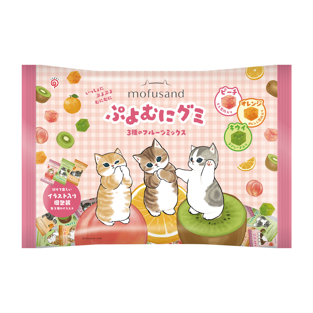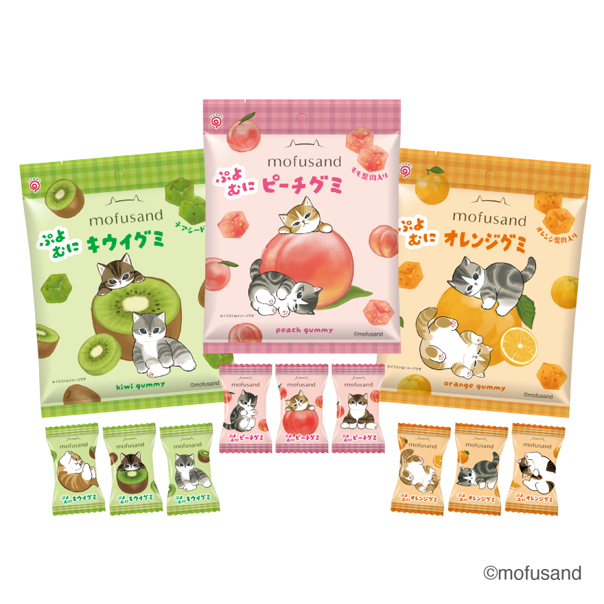 もふもふでキュートで、ちょっとシュールな「mofusand」のにゃんこたちのぷよっ、むにっ、としたピーチ果肉入りピーチ風味グミ。